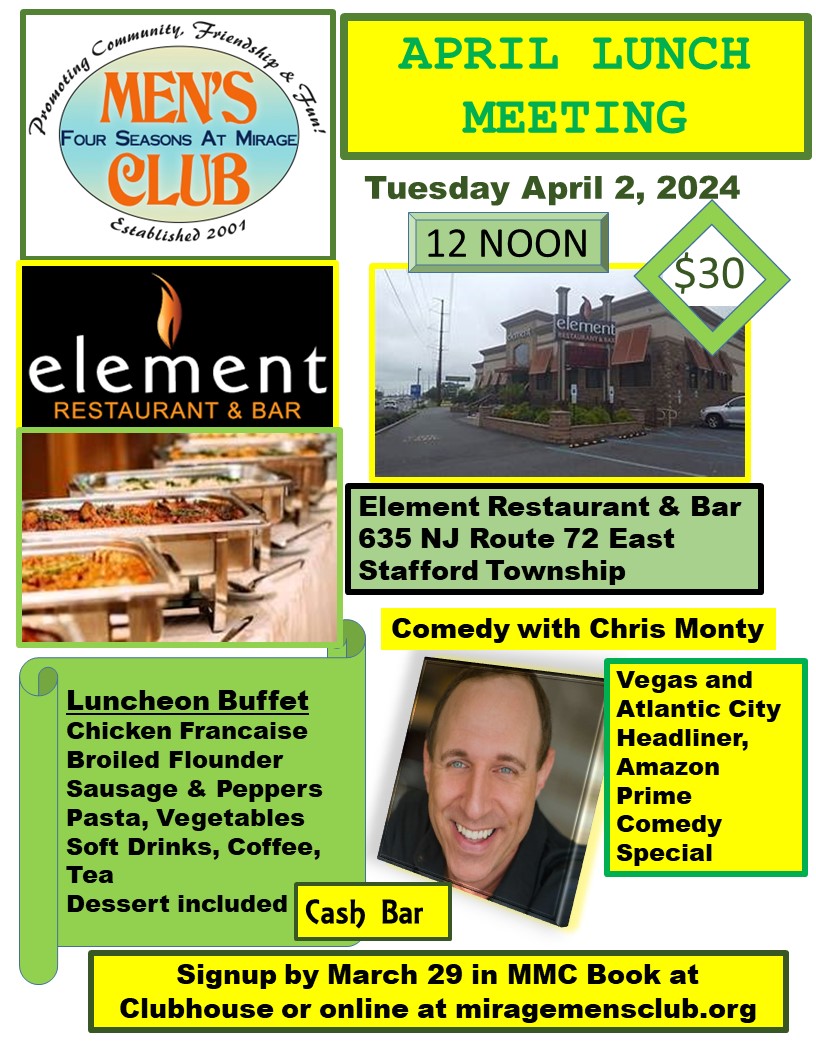 Join the membership for a lbufffet uncheon at Element Restaurant & Bar. Laugh and enjoy the comedy of Chris Monty.