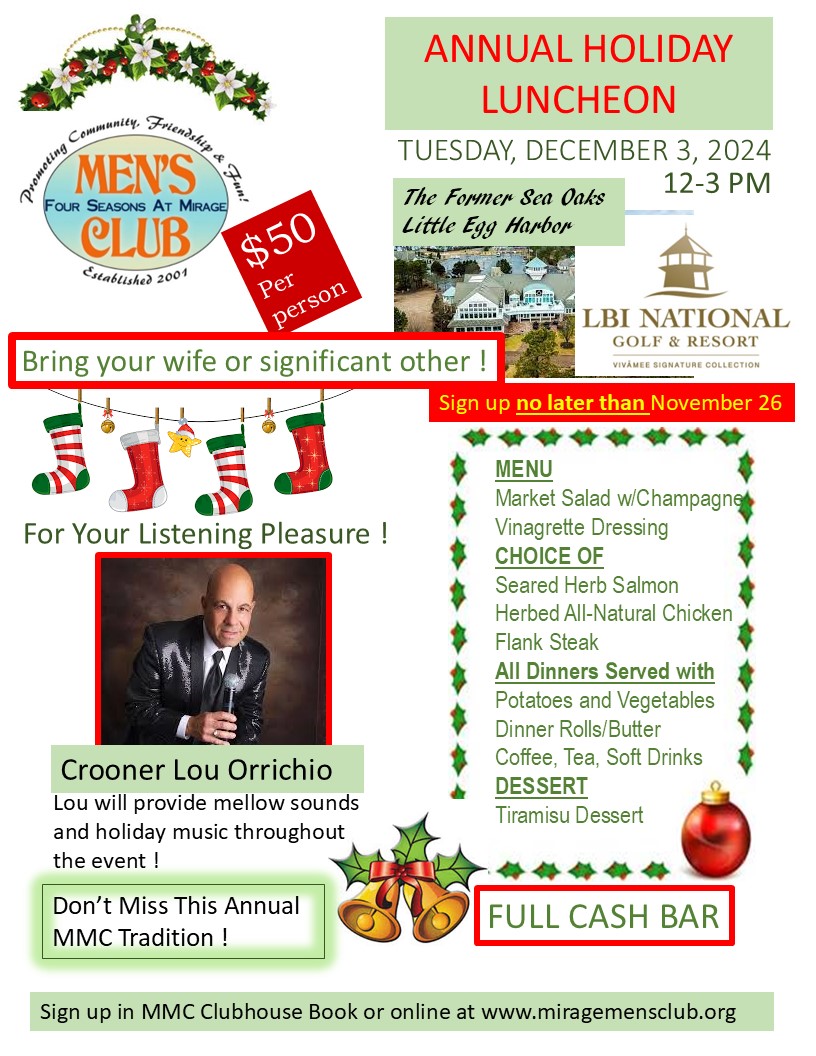 Come to our Annual Holiday Member meeting. Bring a guest, be it a friend, significant other or your spouse.
